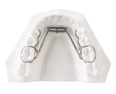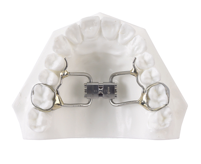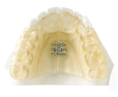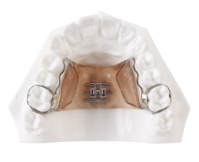 The Haas design incorporates palatal acrylic on each side of the upper vault as expansion screw soldered to bands on the first molars. Positive pressure is exerted evenly on the palatal tissue and teeth with this design.